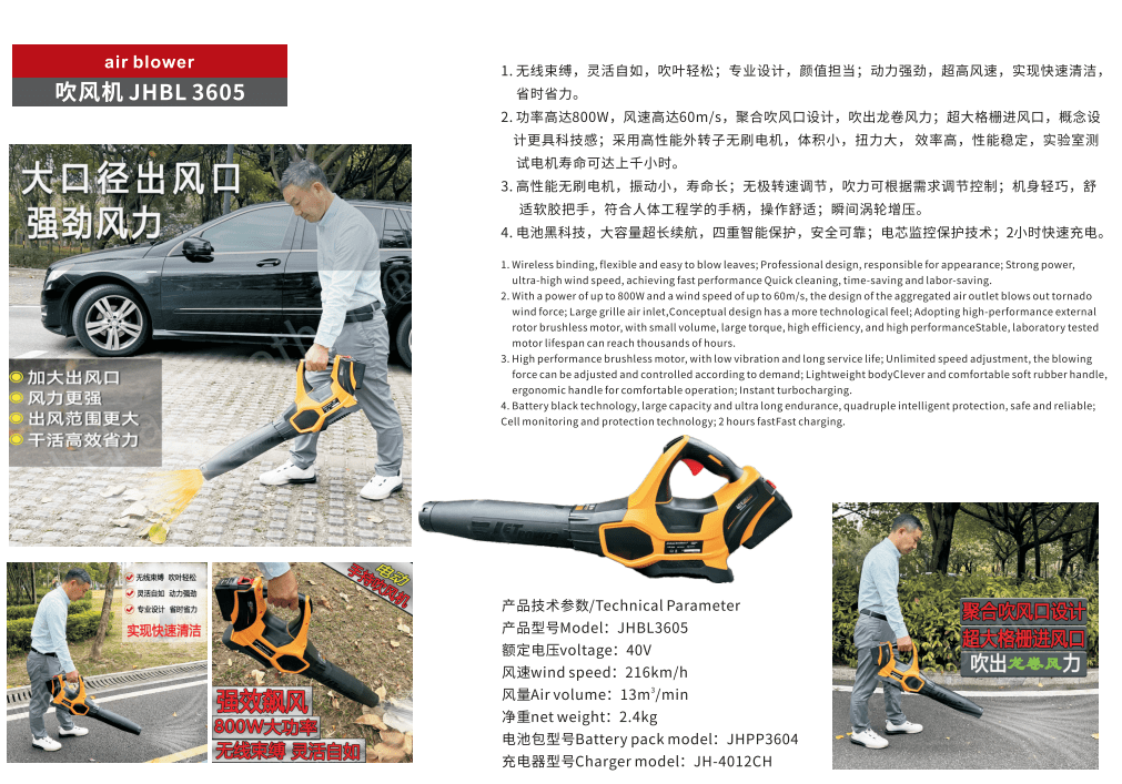 TechnicalParameter Model:JHBL3605 voltage:40V wind speed:216km/h Airvolume:13m/min netweight:2.4kg Batterypackmodel: JHPP3604 Chargermodel: JH-4012CH