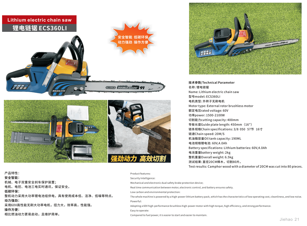 The whole machine is powered bya high-power lithium battery pack, which has the characteristics of low operating cost, cleanliness,and low noise